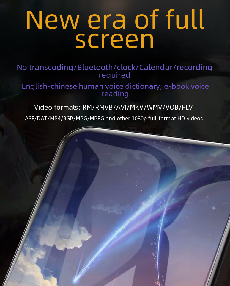 Supports video formats. : DivX,MOV,20503833063,Touch type,TF card,Lithium battery,1000MA,About 20,Multinational,With Speaker,Bluetooth support,Picture browsing,FM radio function,Recording function,External release function,103*63*9,120,Volkswagen,Wedding,Birthday,Festival,Housewarming,Trade Fair,Advertising Promotion,Employee Benefits,Anniversary Celebration,Business Gifts,Opening ceremony,Award commemoration,Public relations planning,Yes,OEM available,OK,OEM,4-7 days,One year,Packing Box USB Cable Manual,2019-10-28,Store Three Guarantees,Invoice Not provided,X20 touch version/Magic Night Black/no Bluetooth 4.0 inch,X20 touch version/Magic Night Black/Bluetooth 4.0-inch,4GB,16GB,ebay,Amazon,wish,AliExpress,Independent station,LAZADA,Africa,Europe,South America,Southeast Asia,North America,Northeast Asia,Middle East,Yes,Yes,Dongda charm,X20,104,In stock,Brand New,Mainland China,USB 2.0,4.0 inches,Color screen,65,000 colors,854*480,MP3,WMA,WAV,OGG,FLAC,APE,ASF,AVI,AMV,VOB,MPEG,DAT,RM,RMVB,VOD,MPEG-4,WMV,Xvid,FLV |