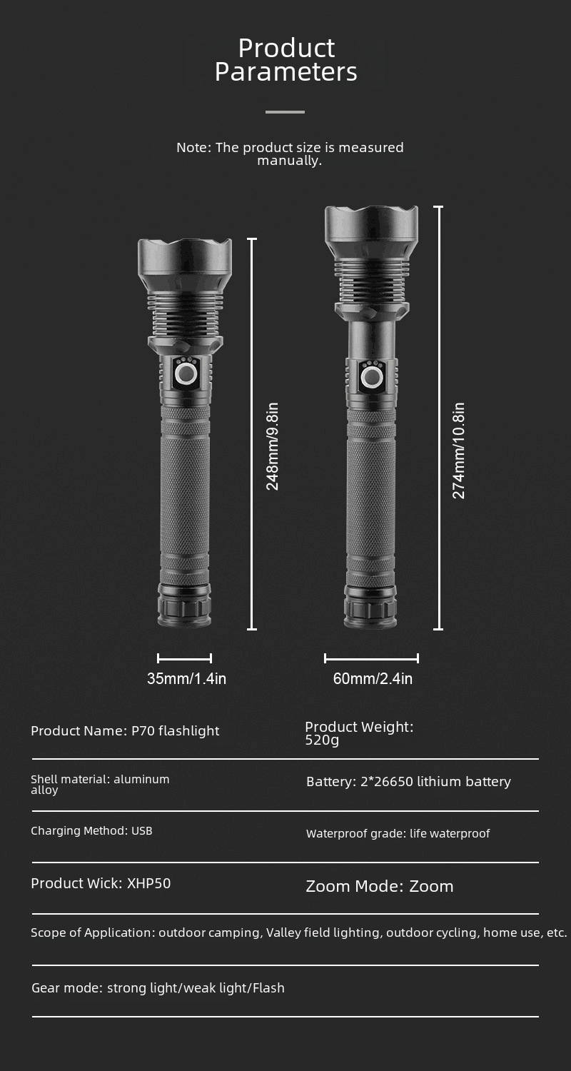 | Color : Short P50 flashlight (no battery),Short P50 flashlight (with a 18650 battery),Short P50 gift box with a section of 18650,Short P50 flashlight (with a 26650 battery),Long P70 flashlight (18650 lithium battery 2),Long P70 flashlight (26650 lithium battery 2),Long P70 flashlight gift box plus two 26650,8215 flashlight P50,8215 P50 flashlight with a 18650 battery,8215 P50 flashlight with a 26650 battery,AliExpress,Southeast Asia,Yes,Yes,TOACH/Toss,Multi-function,No,Aluminum alloy,Zhejiang,5000,Charging,20,LED,TL-8138,Yes,Daily carry,Night Ride,Caves,Night fishing,Patrol,Other,-,Hand pressure,Yes,No,Yes,200-500 m,No |
