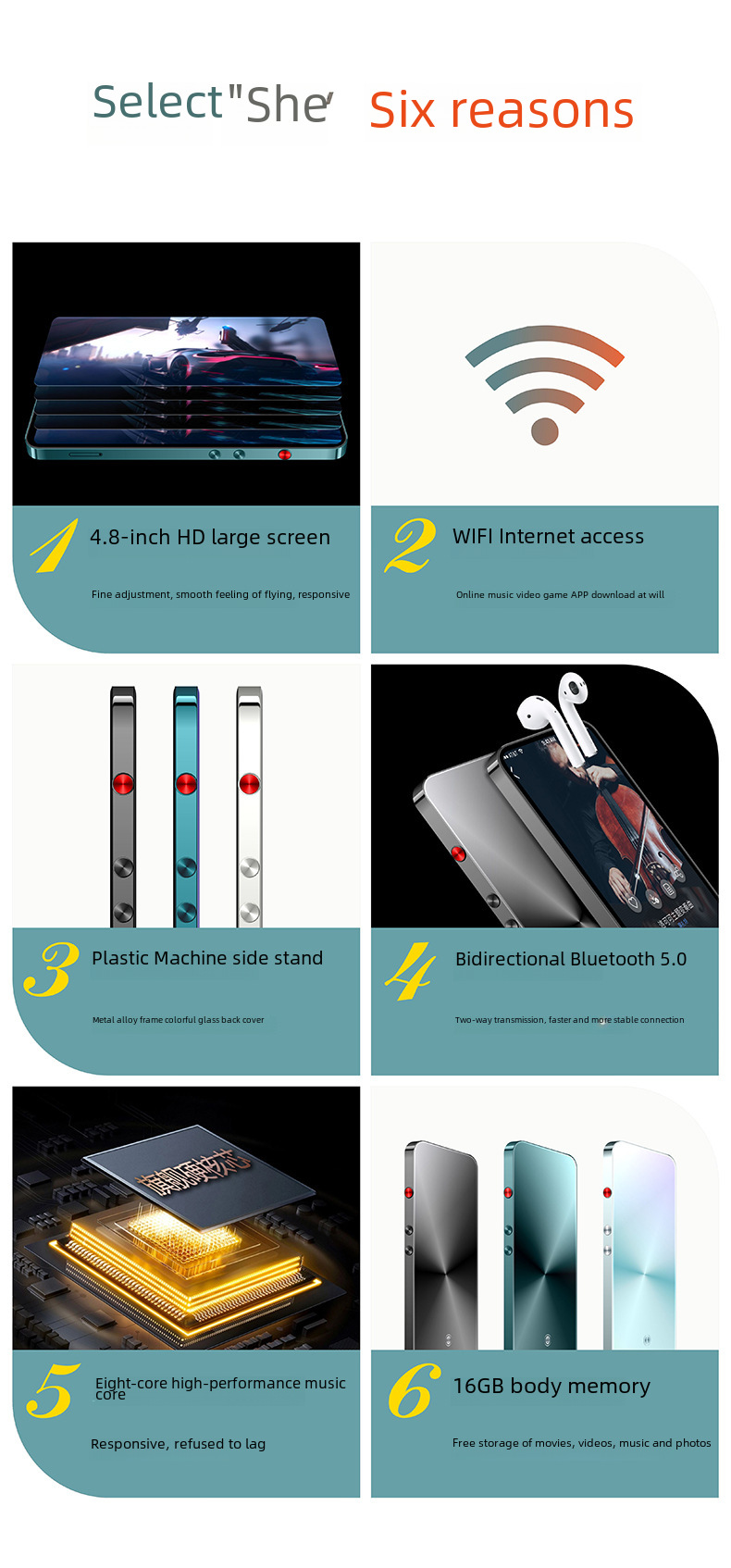 Brand : Mito Yin Yue,Spot,Brand New,Shenzhen,USB 3.0,4.8,HD screen,Touch screen,480*1120,MP3,WMA,WAV,Other,Touch type + Push Button type,SD card,Lithium battery,2050 mA,6,90 kinds of foreign languages, Chinese, English, simplified Chinese,,There are speakers,Support Bluetooth,Picture Browsing,Recording function,External release function,Intelligent operating system,130mm*56.5mm*10.3mm,149,Students, soldiers, office workers,Business Gift,Opening Ceremony,Award Commemoration,Public relations planning,Other,Yes,Can be OEM,Yes,OEM processing,1-3 days,One year,Nose, leather case, data cable,November 2021,National Joint Insurance,Invoice Not provided,Cool black [wifi Internet + support Bluetooth + HD color screen]],Sky City [wifi Internet + support Bluetooth + HD color screen]],Mo Yuqing [wifi + Bluetooth + HD Color Screen]],16GB,Other,Africa,Europe,South America,Southeast Asia,North America,Northeast Asia,Middle East,Yes,Yes,Points for gifts, business gifts, advertising gifts, promotional gifts, conference gifts, festival gifts, public relations gifts, personal gifts,3.5mm |